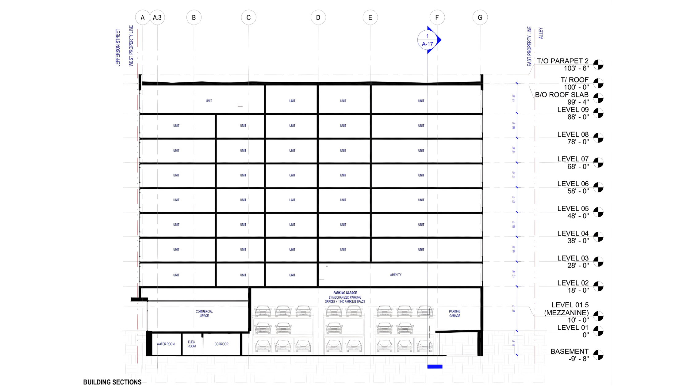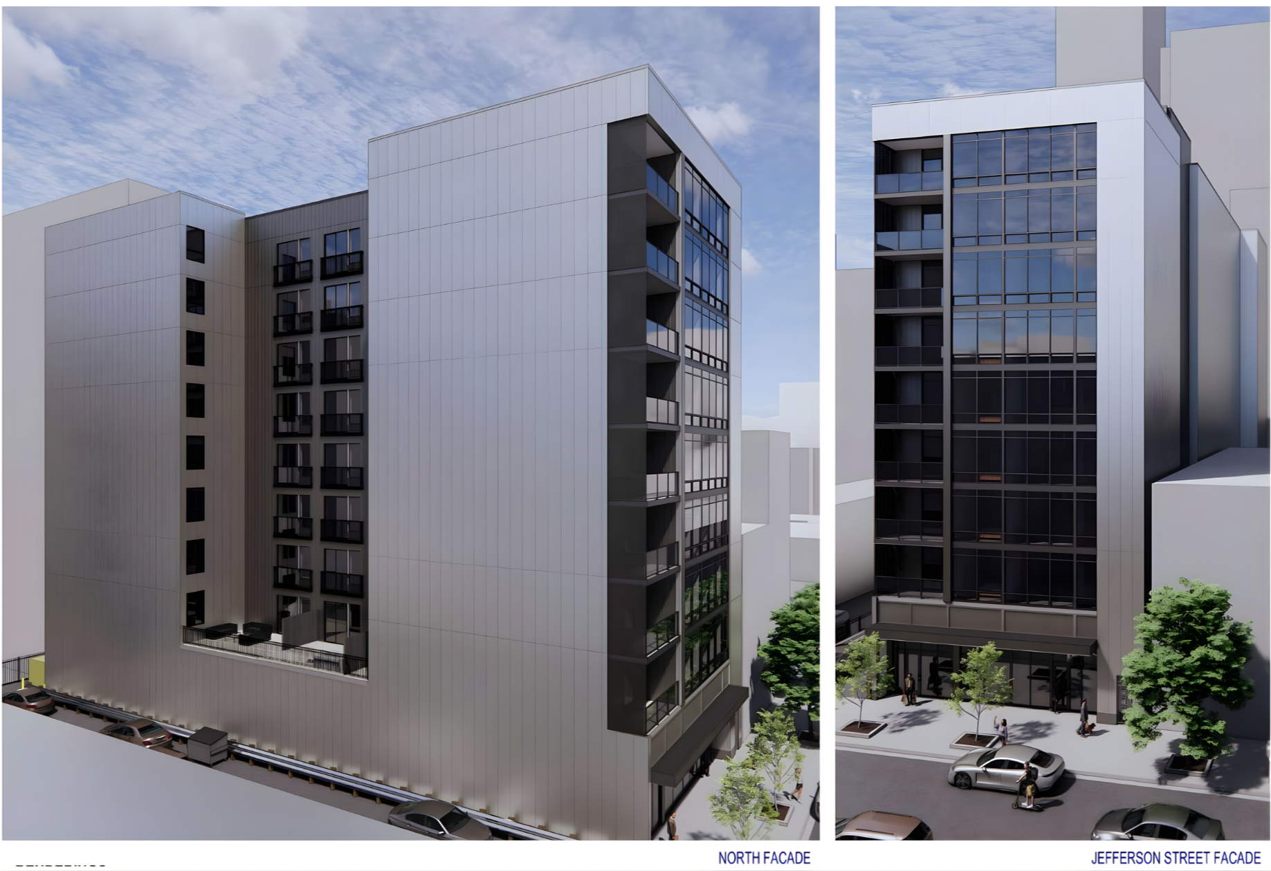 On the ground floor, the building will include approximately 1,130 square feet of retail space, contributing to the walkability and street-level activity along Jefferson Street. Parking will be provided through a 22-space vertical mechanized system, extending into the basement to maximize efficiency on the compact site.
