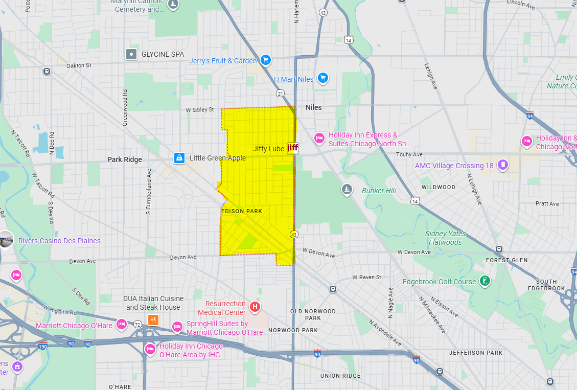 Tucked away near the city’s northern border, Edison Park is a peaceful, tree-lined neighborhood that feels more like a quiet suburb — yet remains proudly part of Chicago. Bordered by Devon Avenue to the south, Pratt Avenue to the north, Narragansett Avenue to the east, and the Des Plaines River to the west, this charming community sits just minutes from O’Hare International Airport, the Cook County Forest Preserves, and the bustling retail hubs of Harlem and Northwest Highway — offering the perfect blend of tranquility, convenience, and small-town charm.