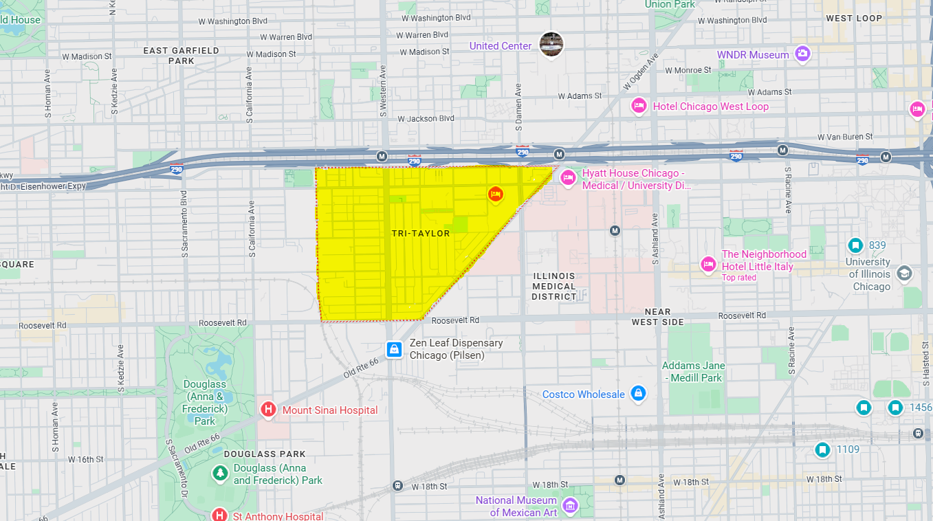 Tucked between the bustling neighborhoods of the Near West Side and West Town, Tri-Taylor is a resilient, up-and-coming community where history, culture, and urban renewal are reshaping the future. Bounded by Roosevelt Road to the north, Taylor Street to the south, Ashland Avenue to the east, and Damen Avenue to the west, this compact but vibrant neighborhood lies just steps from University of Illinois at Chicago (UIC), the Illinois Medical District, and the cultural energy of Pilsen — making it one of the city’s most strategically located and transformation-ready areas.